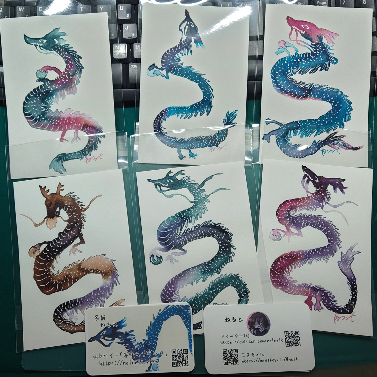 こちらの展示、「幸せを招く絵はがき展」に出させていただいた作品たちです。会場の様子は上記URLから確認できますので、直接行けない人もそちらを見ていただけたらと思います。はがきサイズ緑赤青紫赤青茶紫緑紫紫赤