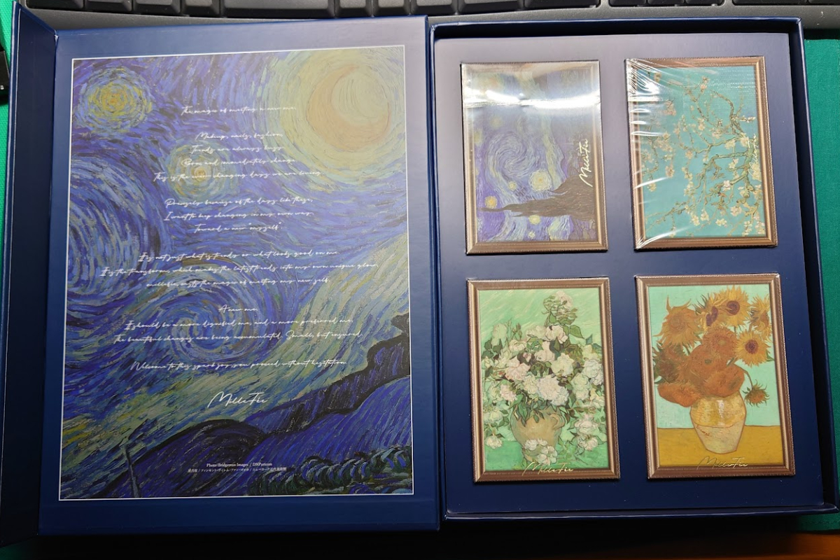 こちらは本日帰宅後に届いたものなんですけど、ゴッホさんの絵をモチーフにしたアイシャドウかなんかです。アイシャドウどころかメイクすらさっぱりなのに買ってしまいました、飾ります。