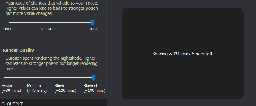 パラメーター設定のバーの下には~3時間と書いてあったので、こんなことになっているとは思ってもいませんでした。出勤直前に急いで起動したので開始時の残り時間は確認しておらずビビりました。少なくともナイトシェードのフルパワーを使用するのはこのパソコンでは厳しそうですね、残念。